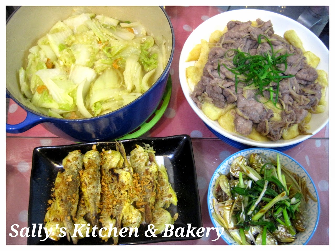 蝦米煮皇芽白,蝦醬豆卜蒸豬肉,香煎及清蒸獅頭魚