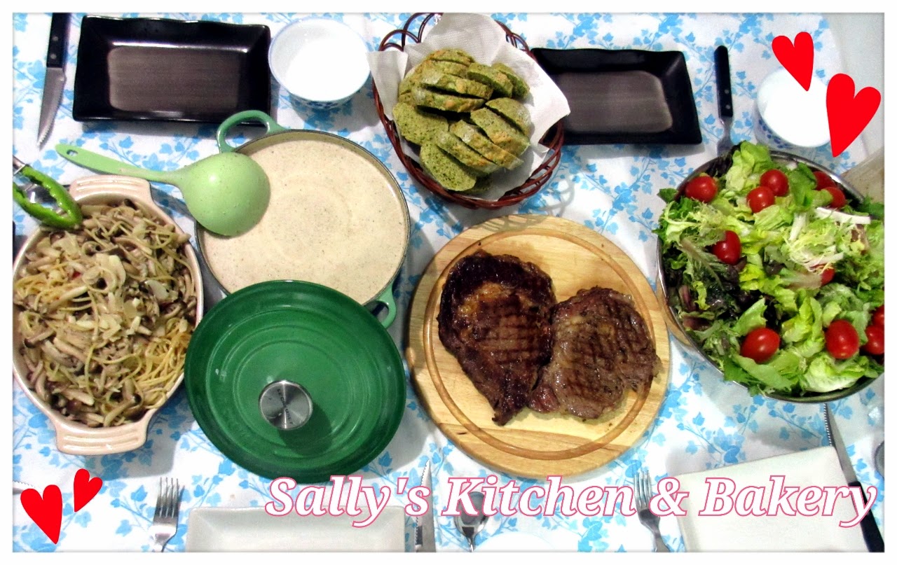 忌廉蘑菇湯, 菠菜麵包, 雜菜沙律, 香煎安格斯心型牛扒, 辣炒蒜片香菇炒意粉!