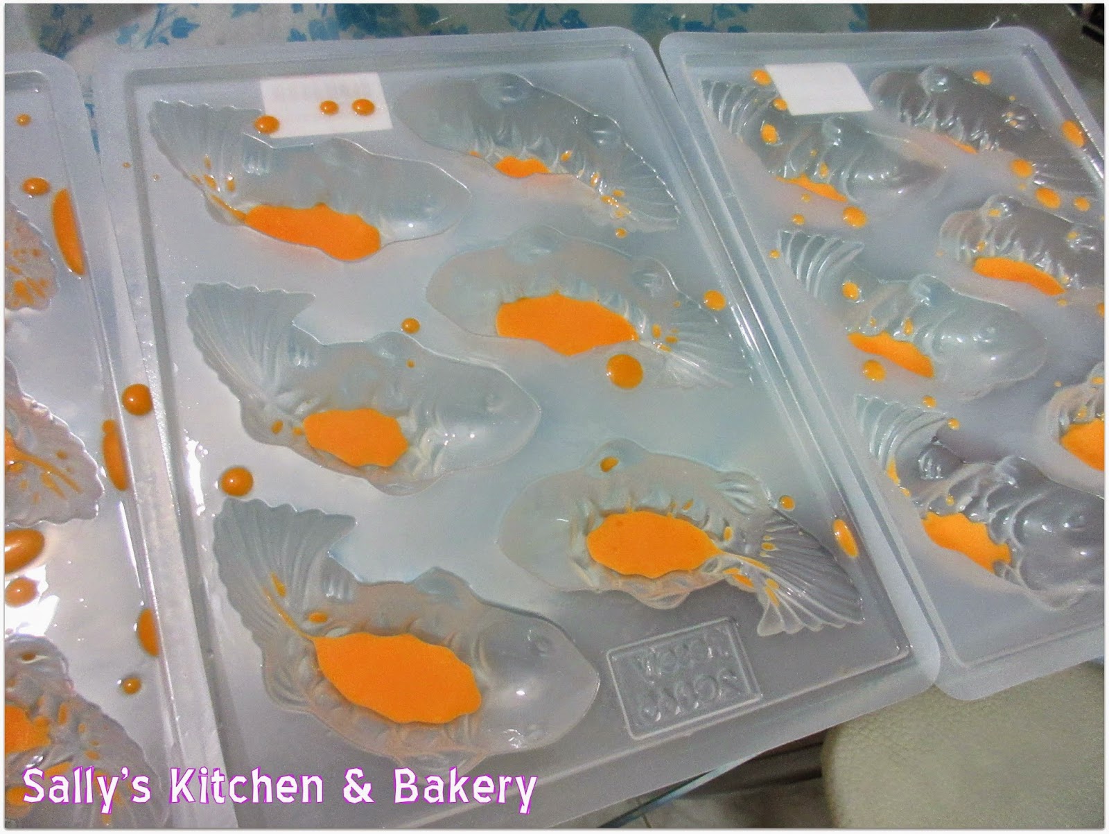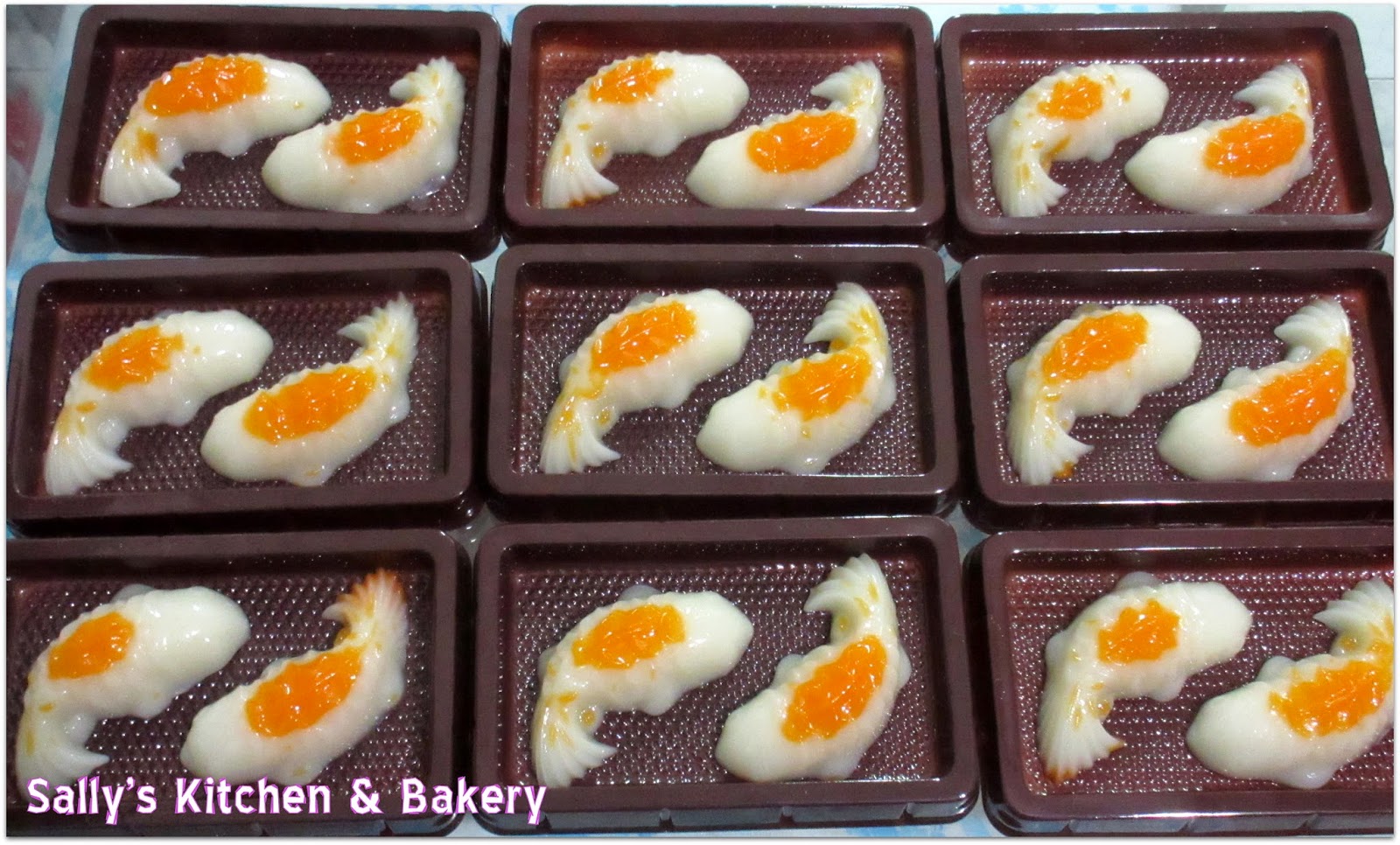6. 薄簿地塗一層油於魚模內 (方便脫模),然後加入適量的橙色粉漿於魚鰭及魚尾部分,隔水用大火蒸4分鐘定型。