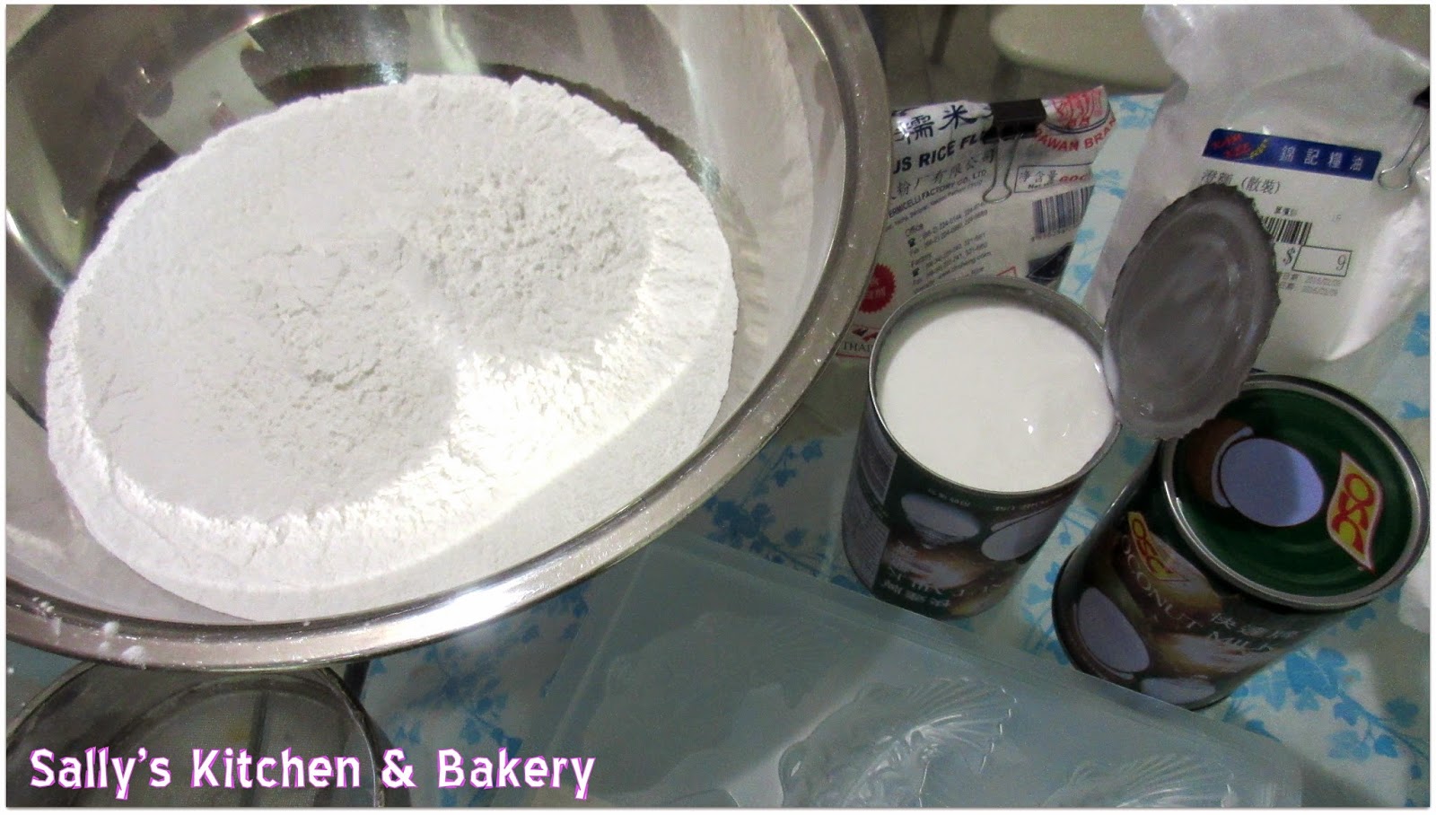 2. 糯米粉及澄麵粉放到同一個大碗內,之後加入椰漿攪勻直至粉漿都沒有粉粒。然後加入1滴油及雲尼拿油2滴 (防止乾裂及增加香味)