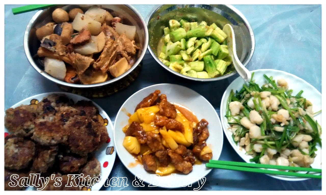 炆小盤菜,拍青瓜,小帶子炒芹菜,鮮菠蘿古魯肉,仲有嫲嫲的家鄉煎藕餅