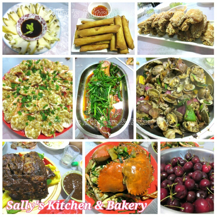 冰鎮鮑魚,炸墨魚春卷,炸雞翼,金銀蒜粉絲蒸開邊蝦,清蒸東星斑,豉汁炒蜆,醬燒豬仔骨,清炒菜心,薑蔥炒蟹,車厘子