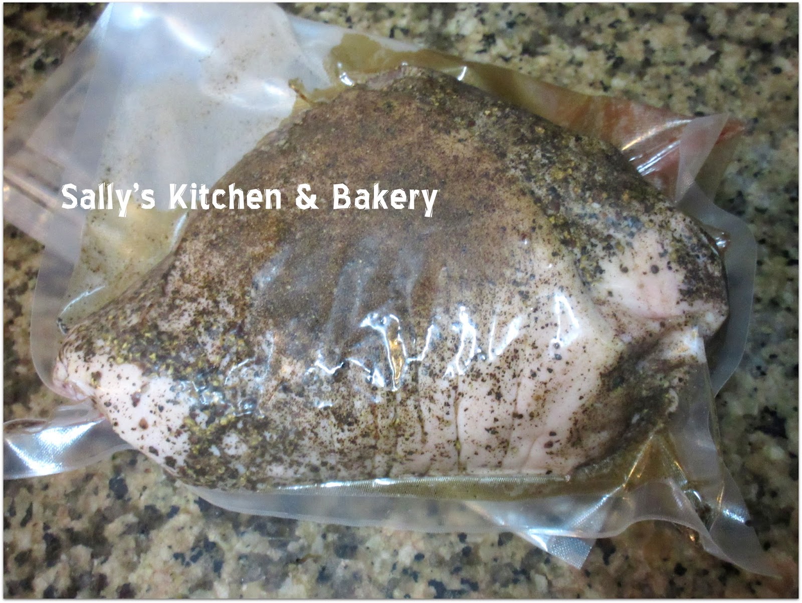1. 鹹豬手解凍溶雪,洗淨抹乾水氛,然後放入真空袋,加入黑椒碎,用真空機包好。