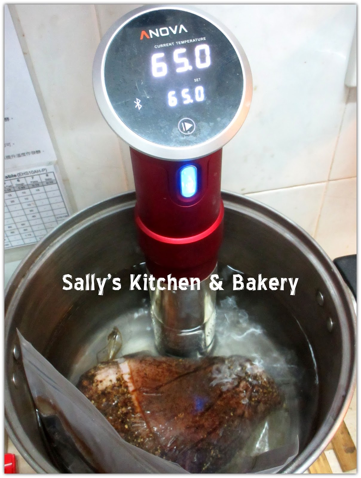 2. 低溫慢煮棒放在已注入水的大煲內調較好所需溫度,水份要足夠蓋過整隻鹹豬手,當達到指定溫度後便可放入已真空的鹹豬手。我今次調較了攝氏65度,烹煮12小時。