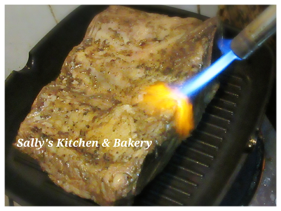 4. 當8-10小時後,牛仔骨從真空袋取出,放上已燒至非常熱的鑊中煎封及邊位,同時間用火槍火燒骨位,大約煎約2分鐘,便可上碟。