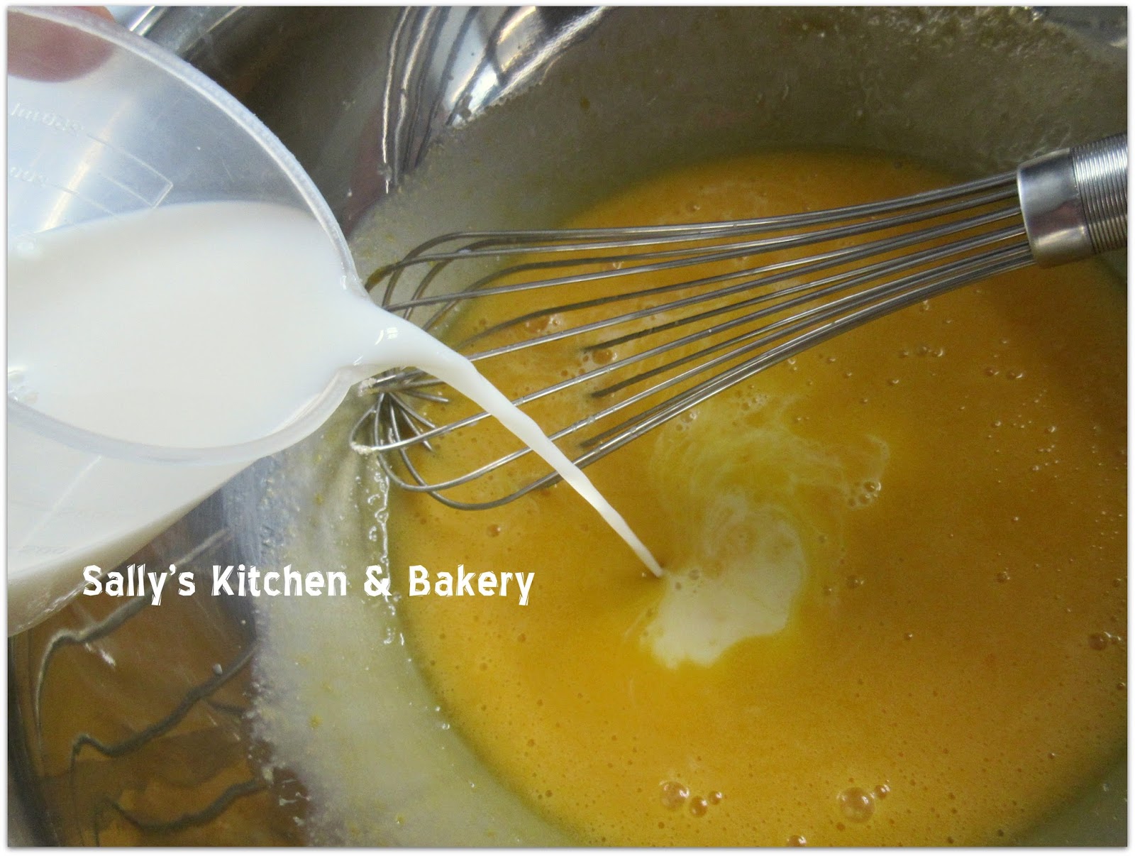 4. 蛋黃加入糖(a)20g攪勻,再加入牛油攪勻,再加入煉奶水攪勻。