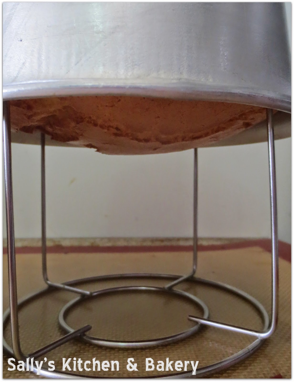 9. 蛋糕出爐後立即從半尺高利用地心吸力放手摔到枱面處,然後便倒扣放涼。