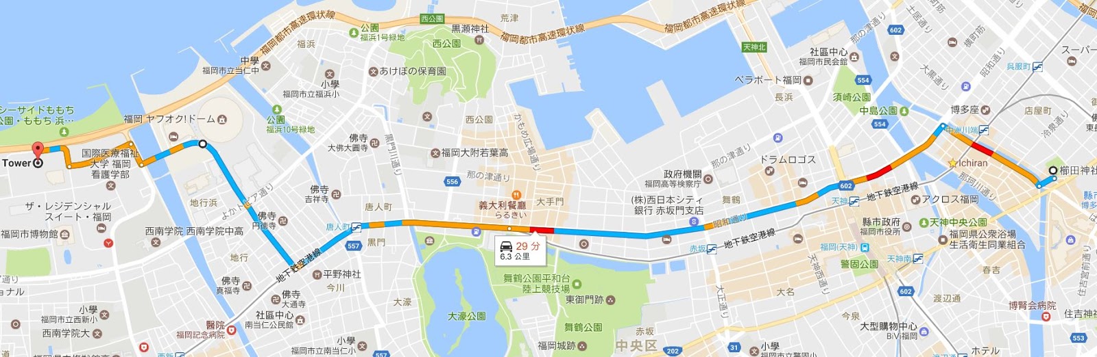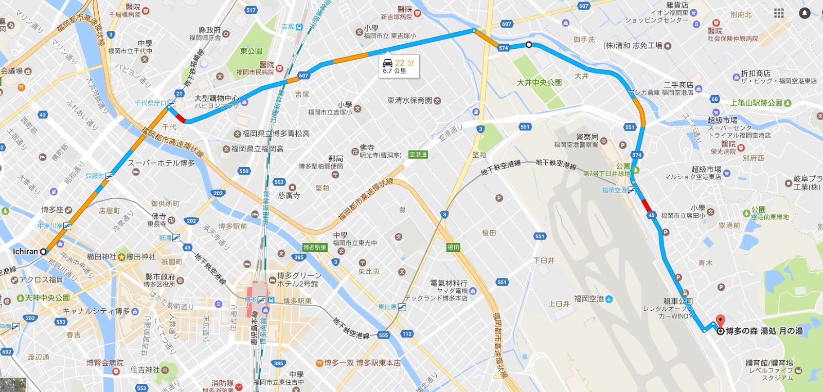 [一蘭拉麵總店 至 博多の森 湯処 月の湯 , 6.7km 25mins]