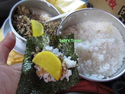而且還預備了午餐: 都是飯糰呢~~~ 哈哈哈哈哈!!!!! 洋蔥肉碎配上黃蘿蔔,美味~~