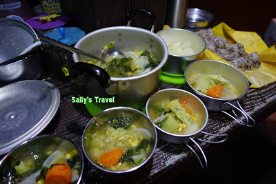 9:15pm 是日晚餐開動: 雜菜麵豉湯,飯素飯糰,炭燒牛肉豬肉