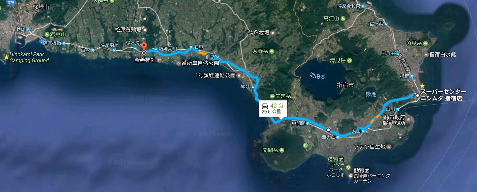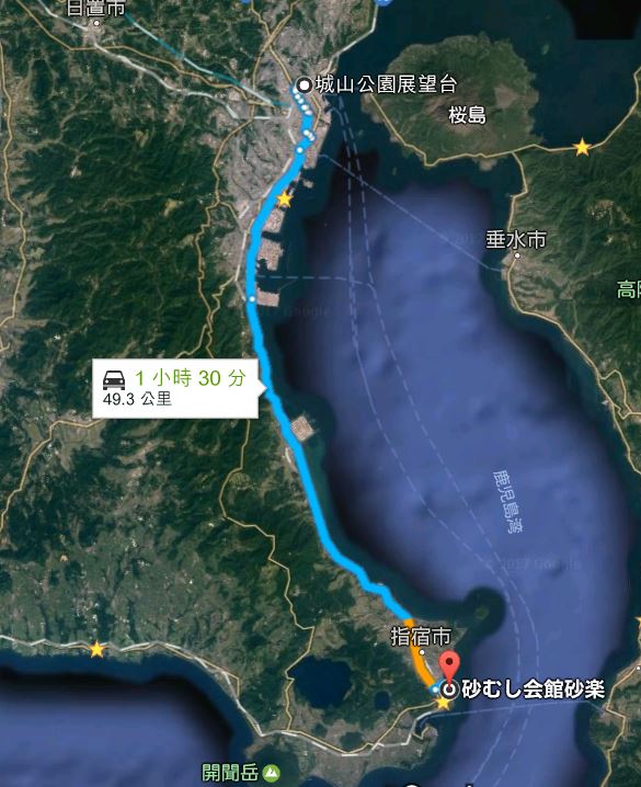 1:30pm 離開城山展望台 [城山展望台=>指宿砂むし温泉, 50km, 1hr30mins]