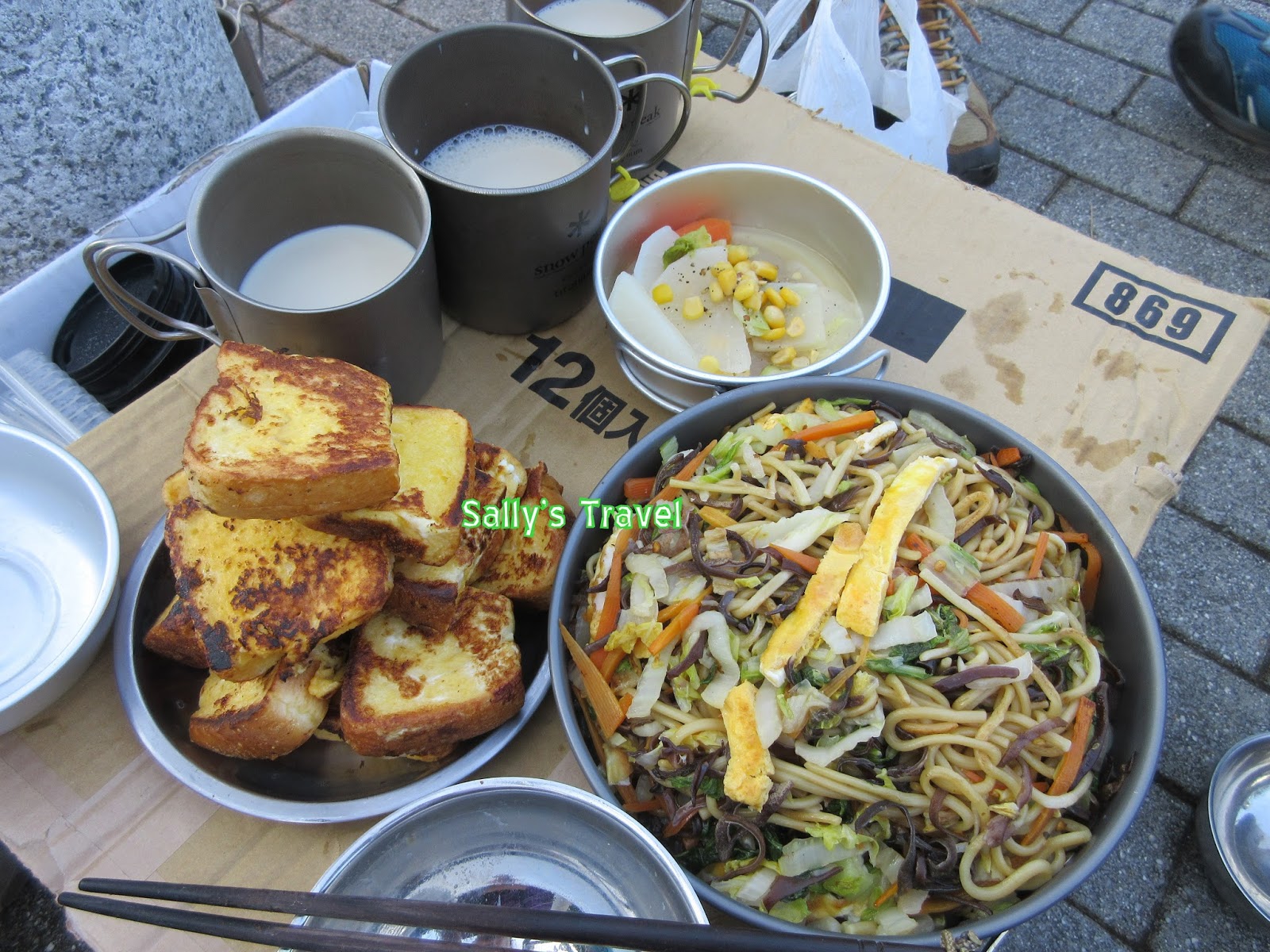 早餐時間: 雜菜絲蛋絲炒麵,雞蛋煎多士,豆漿