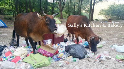 究竟收拾好的垃圾為什麼我說要放在安全地方?? 因為浪茄的牛隻已經懂得把垃圾從垃圾桶扯出垃圾開大餐,我們看到牛隻食垃圾會盡力驅趕,不是怕滿地垃圾,而是牛隻不懂分辨那些是食物,那些是膠袋,如果牛隻把膠袋一拼吞下肚,其實牠會很快死掉的。