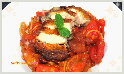 不想煮太多,簡簡單單,煮個簡易晚餐!!! 我們仍是離不開辣!! 不喜歡辣的可以什麼辣的東東也不加,自己調味到合適味道便可以啦!!! 其實唔喜愛雞扒,配上煎豬扒, 牛扒一樣可以啦啦啦!! 香煎雞扒蕃茄洋蔥炒意粉 (2-3人份) 材料: 意粉 240g 雞扒 1大塊(約300g) 蕃茄 6個(切角) 洋蔥 1-2個(切絲) 蒜頭 6粒(切碎) 辣椒 3-4隻(切粒) <我們太愛辣,... 看全文 -