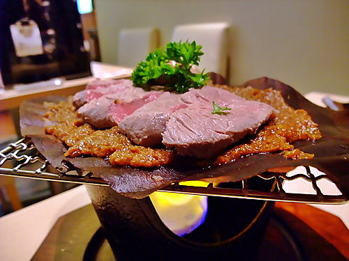 朴 葉 先 放 上 麵 豉 醬 做 底 ,再 加 上 5 片 3 成 熟 嘅 和 牛 及 冬 菇 ,朴 葉 散 發 嘅 香 氣 慢 慢 熏 入 牛 肉 之 中