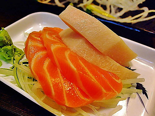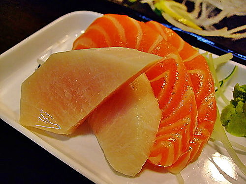 雙 色 刺 身 係 三 文 魚 刺 身 + 劍 魚 腩 刺 身 各 2 片