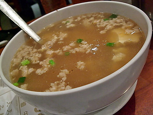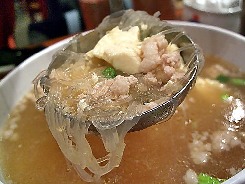 肉 碎 豆 腐 粉 絲 湯 先 上 ,一 大 湯 碗 2 個 人 差 啲 飲 唔 晒