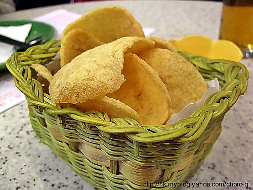 一 坐 低 先 奉 上 一 小 籃 香 脆 蝦 片 ,送 嘅!