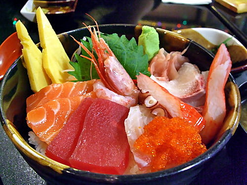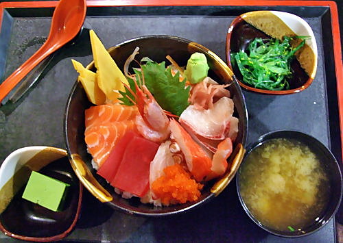 特 選 雜 錦 刺 身 飯 包 括 三 文 魚 、吞 拿 魚 、鱆 紅 魚 、甜 蝦 、 魚 、八 爪 魚 、蟹 柳 、蟹 籽 、玉 子 ,絕 對 係 大 堆 頭 製 作
