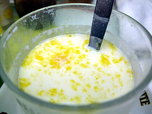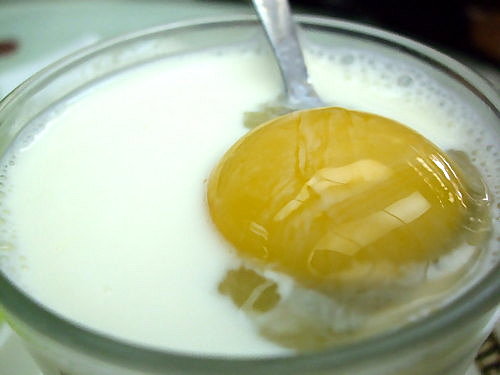 成 隻 鮮 雞 蛋 打 落 熱 鮮 奶 度 ,然 後 攪 勻 佢 . . .