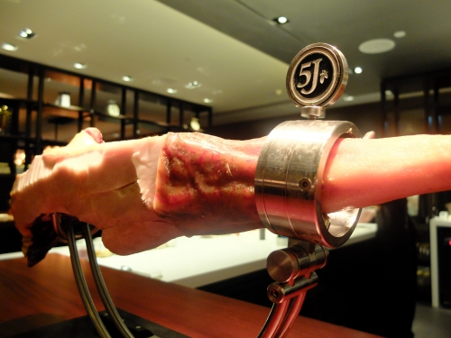 酒 吧 區 及 品 酒 師 之 桌 設 在 餐 廳 近 門 口 處,當 我 看 見 桌 上 放 了 西 班 牙 的 極 品 5J Iberico ham,即 時 流 出 口 水 了。說 起 5J,據 網 上 資 料 他 其 實 是 一 個 已 超 過 130 年 歷 史 的 西 班 牙 最 大 火 腿 品 牌 Sanchez Romero Carvajal 旗 下 的 頂 級 黑 毛 豬 風 乾 火 腿。本 地 曾 經 有 人 在 blog 中 將 這 個 5J 說 成 是 質 素 的 分 級,他 說 Iberico ham 的 質 素 分 1J 至 5J,5J 為 最 高,我 真 的 看 到 目 定 口 呆。