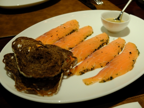 自 家 醃 製 三 文 魚 配 小 茴 香 芥 末 醬 及 亞 麻 籽 多 士 ($150) 三 文 魚 是 醃 得 不 錯 的,只 是 味 道 上 沒 有 特 別 驚 喜。