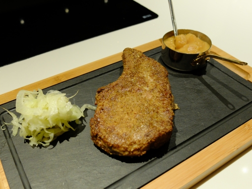 英 國 巴 克 夏 黑 豚 扒 配 茴 香 碎 及 蘋 果 蓉 ($280) 廚 師 選 用 英 國 巴 克 夏 的 Six Point Berkshire 黑 豚 扒 ,Six Point 是 黑 豚 級 數 中 最 頂 級 的。豚 肉 是 必 然 的 超 鬆 化,本 來 不 想 蘸 醬 汁,但 德 國 大 廚 的 祖 傳 秘 方 自 家 製 蘋 果 蓉 實 在 太 誘 人,豚 肉 一 蘸 香 甜 的 蘋 果 蓉,即 時 產 生 微 妙 的 化 學 作 用,感 覺 就 如 一 些 鑊 氣 小 炒,加 了 兩 滴 豬 油 提 味 一 樣。