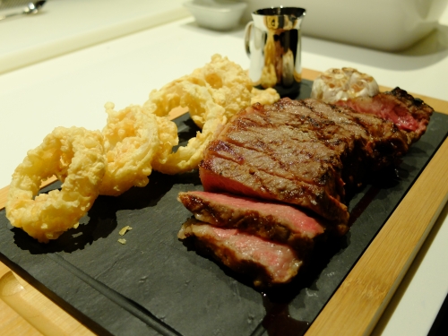 20 安 士 頂 級 安 格 斯 牛 扒 配 洋 蔥 圈 及 自 家 秘 製 醬 汁 ($680) 牛 扒 質 素 高,烤 得 有 水 準,就 不 必 理 會 醬 汁 是 否 自 家 秘 製 了,而 以 上 正 正 是 我 試 吃 的 第 一 口 感 受。