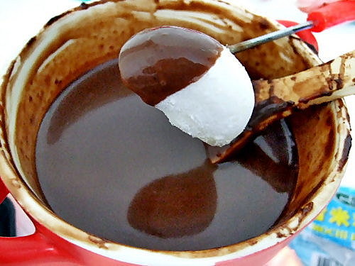 雪 米 糍 滲 咗 朱 古 力 漿 後 等 十 幾 秒 ,一 冷 一 熱 令 朱 古 力 漿 變 咗 層 脆 皮 ,再 等 一 陣 一 啖 咬 落 去