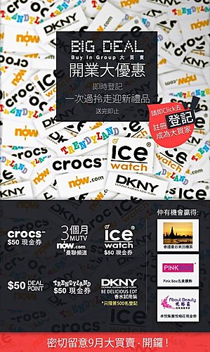 團 購 網 個 名 叫 Big Deal ,中 文 叫 大 買 賣 ,喺 我 個 Blog 右 邊 欄 都 會 見 到 有 條 好 搶 眼 嘅 紅 色 banner ,下 星 期 正 式 運 作 了 ,唔 知 你 click 咗 入 去 ,登 記 咗 未 呢?