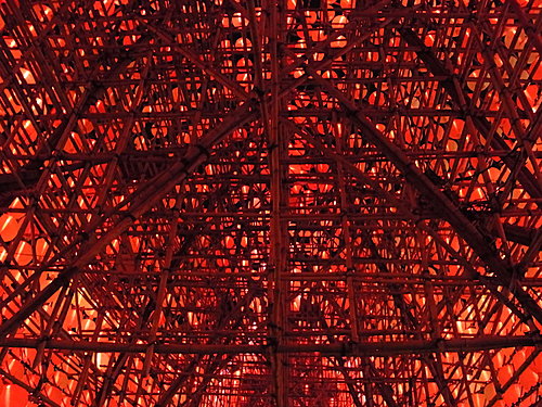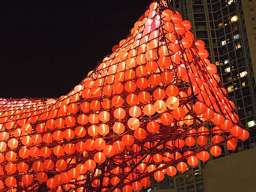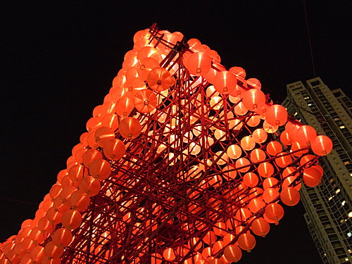 中 式 燈 籠 用 LED 燈 發 光 ,由 電 腦 控 制 ,會 配 合 音 樂 砌 出 唔 同 嘅 圖 案。