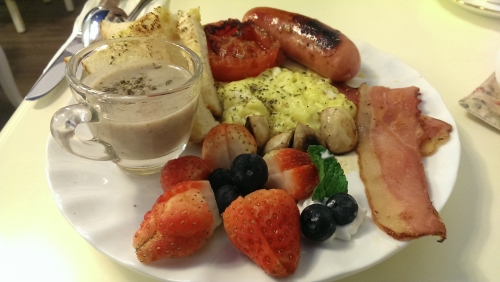 全 日 早 餐 ($115) 是 晚 餐 價,散 點 是 $85,當 然 是 前 者 划 算 了。全 日 早 餐 包 括 蘑 菇 湯、脆 多 士、炒 蛋、煙 肉、香 腸、煎 蕃 茄 及 鮮 果,豐 富 之 餘 賣 相 亦 一 流。