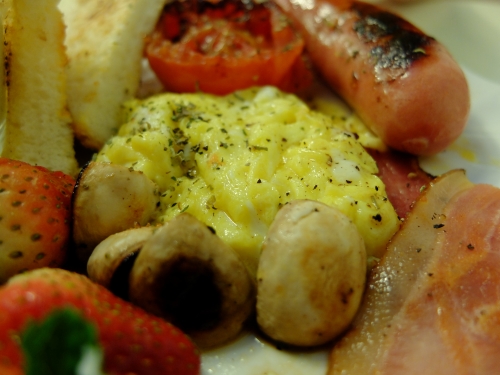 全 日 早 餐 ($115) 是 晚 餐 價,散 點 是 $85,當 然 是 前 者 划 算 了。全 日 早 餐 包 括 蘑 菇 湯、脆 多 士、炒 蛋、煙 肉、香 腸、煎 蕃 茄 及 鮮 果,豐 富 之 餘 賣 相 亦 一 流。