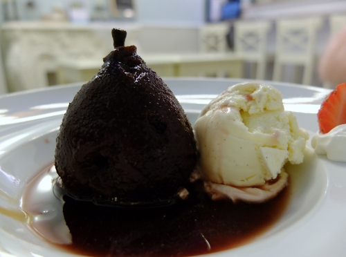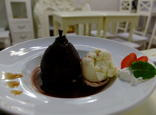 這 裡 的 紅 酒 洋 梨 跟 市 面 食 開 的 紅 酒 燴 梨 無 論 色 澤 及 味 道 也 有 所 不 同,原 來 紅 酒 混 入 了 肉 桂、丁 香、八 角、蜜 糖 及 香 橙 去 煮 過,洋 梨 口 感 軟 腍,味 道 香 甜 中 帶 有 不 同 的 層 次,複 雜 得 來 其 實 好 簡 單,好 味 就 是 了。