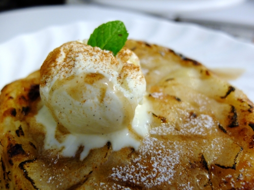 加 了 焦 糖 的 洋 梨 切 成 薄 薄 一 片 片,再 輕 輕 微 烤,令 焦 糖 香 味 更 突 出,雪 糕 球 上 再 淋 上 楓 糖,甜 到 入 心 了。