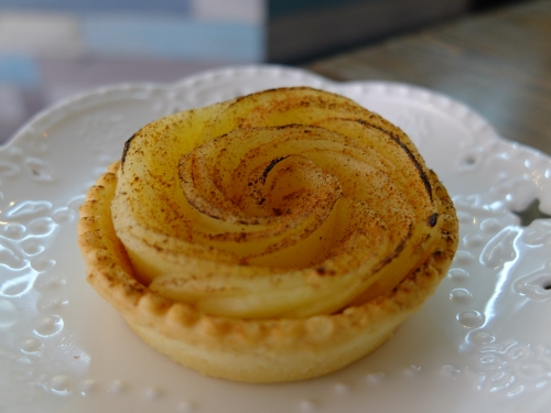 玫 瑰 花 蘋 果 撻 ($28) 一 片 片 的 蘋 果 捲 成 玫 瑰 花 形,賣 相 足 以 令 妳 心 動 吧?蘋 果 撻 焗 到 香 噴 噴,帶 一 點 焦 香,入 口 果 香 味 甜,牛 油 皮 撻 香 口 鬆 脆,一 邊 寫 一 邊 回 味 著,又 留 口 水 了。