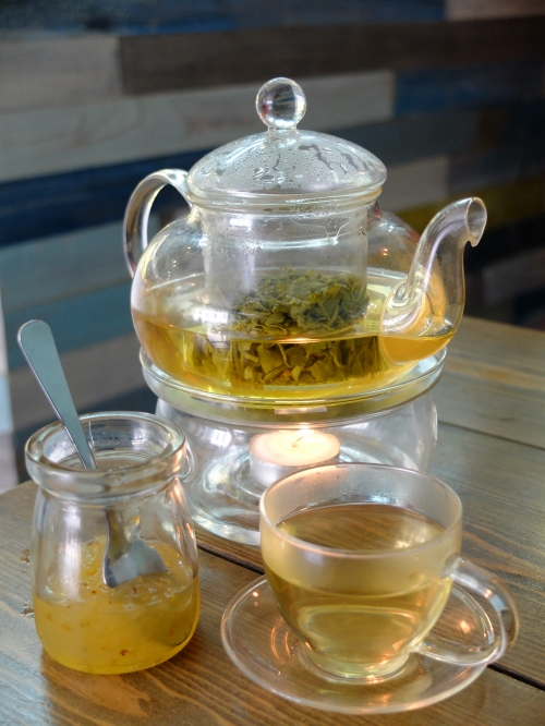 特 製 果 醬 綠 茶 ($55 For 2) 不 是 用 茶 包,而 是 用 原 片 茶 葉,加 了 兩 轉 熱 水 後,茶 味 依 然 香 濃,這 裡 是 2 人 的 份 量。