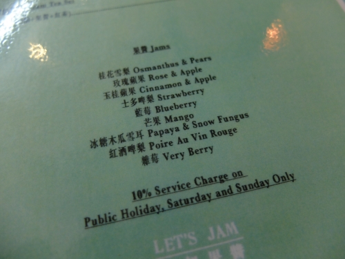 果 醬 口 味 包 括 玫 瑰 蘋 果、桂 花 雪 梨、肉 桂 蘋 果、芒 果、士 多 啤 梨、藍 苺、紅 酒 啤 梨、冰 糖 木 瓜 雪 耳 及 雜 莓 共 9 款。餐 牌 上 的 大 部 份 美 食 以 至 飲 品,也 可 任 選 任 何 果 醬 去 配 搭 出 自 己 喜 愛 的 口 味。