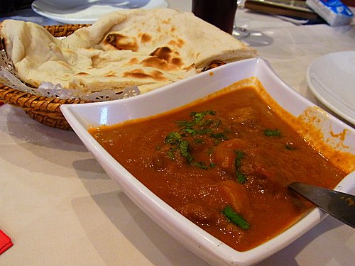 咖 喱 牛 配 烤 包 ,醬 汁 濃 稠 ,香 而 不 辣 ,蘸 包 食 一 流。