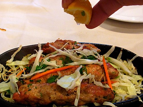 滴 少 少 檸 檬 汁 喺 免 治 羊 肉 卷 上 提 味 ,鐵 板 即 時 以 聲 音 作 和 應 ,視 、聽 、嗅 覺 同 時 獲 得 最 佳 嘅 享 受。