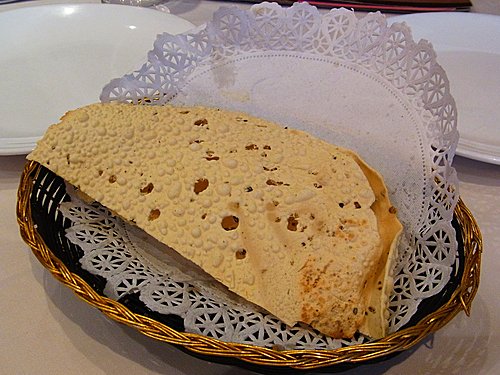 餐 前 送 上 大 大 塊 薄 餅 ,脆 中 帶 硬 ,不 夠 鬆。
