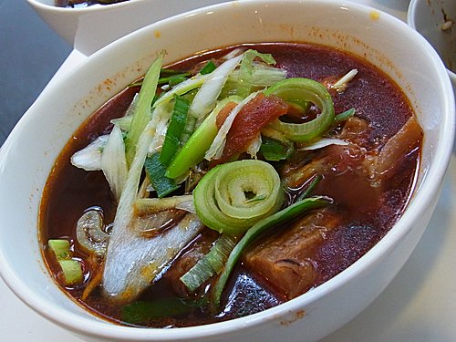 三 星 牛 肉 麵 ($45) 係 店 子 的 招 牌 麵 ,有 紅 燒 ,麻 辣 及 蕃 茄 3 種 湯 底 可 以 選 擇 ,每 款 湯 底 都 以 牛 筒 骨 及 多 種 配 料 熬 足 13 個 鐘 頭 而 成 ,主 配 料 有 牛 腩 、牛 肚 及 牛 筋 ,再 配 以 大 量 日 本 京 蔥。選 咗 紅 燒 湯 底 試 試 ,上 到 枱 時 ,我 跟 Meling 話 : 「好 似 宜 蘭 的 牛 肉 麵 喎!」