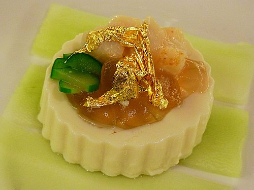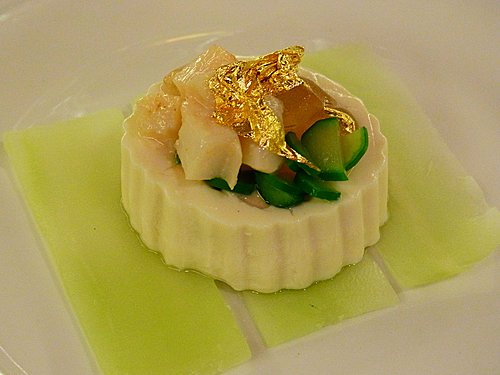 金 衣 白 玉 (涼 拌 蘆 薈 帶 子 滑 豆 腐) 白 玉 係 滑 滑 的 豆 腐 ,金 衣 呢?當 然 係 大 大 片 金 箔 了。配 料 中 還 有 蘆 薈 及 帶 子 ,而 豆 腐 下 方 則 有 3 塊 喺 香 港 較 難 食 到 的 窩 筍 片。