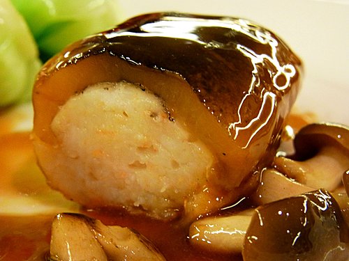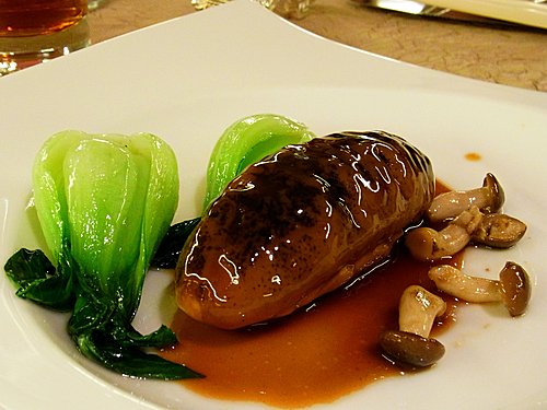 用 刀 輕 輕 一 切 ,原 來 內 有 乾 坤 ,厚 身 但 爽 滑 的 海 參 釀 滿 了 彈 牙 蝦 膠 ,又 爽 又 彈 ,口 感 一 流。
