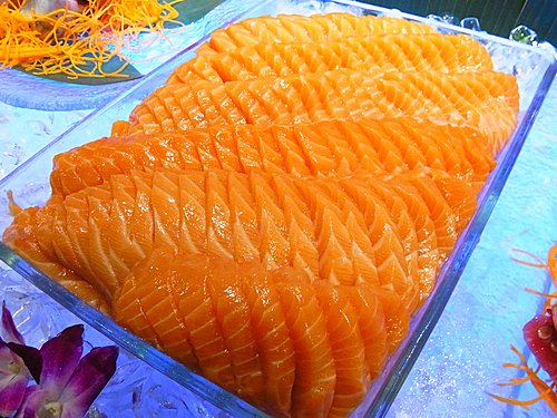 三 文 魚 刺 身 厚 切 ,肥 美 有 光 澤 ,一 大 盤 上 引 死 人。
