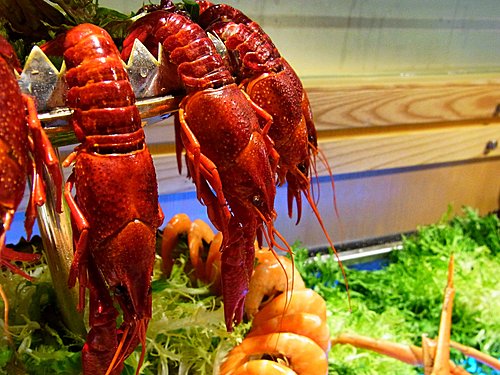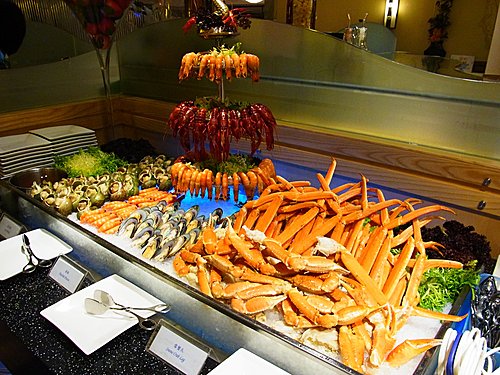 冰 鎮 海 鮮 區 自 成 一 國 ,阿 拉 斯 加 蟹 腳 、鱈 場 蟹 腳 、凍 蟹 、小 龍 蝦 、凍 海 蝦 、翡 翠 螺 、青 口 樣 樣 齊。