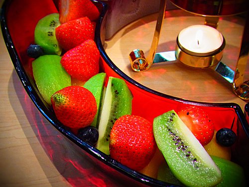 鮮 果 盤 有 蜜 桃 、士 多 啤 梨 、奇 異 果 及 藍 莓 ,唔 蘸 朱 古 力 醬 就 咁 食 都 一 樣 咁 正。