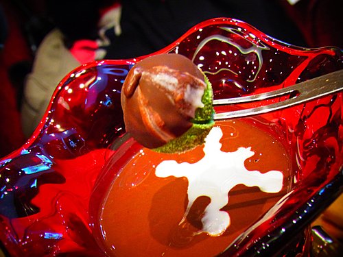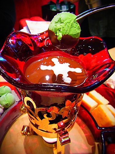 雪 糕 球 蘸 上 朱 古 力 醬 ,等 凝 固 成 朱 古 力 皮 之 後 ,再 放 回 朱 古 力 醬 中 ,做 成 雙 重 口 感 ,無 得 頂。