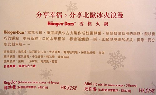 Haagen-Dazs 店 去 得 多 ,但 從 未 去 過 佢 哋 所 舉 辦 的 任 何 活 動 ,早 幾 日 卻 突 然 收 到 神 秘 電 話 ,有 聖 誕 禮 物 收?請 我 食 雪 糕 火 鍋?好 受 寵 若 驚 喎!自 己 從 來 唔 獨 食 ,今 次 更 加 獨 食 唔 嚟 ,咁 大 盆 雪 糕 火 鍋 喎 . . . 於 是 相 約 Meling 、Alice 、Tika 、Alison 及 Alan 5 位 老 友 ,到 Haagen-Dazs 的 皇 室 堡 新 店 收 禮 物 ,喺 度 要 多 謝 2 位 公 關 的 細 心 安 排。