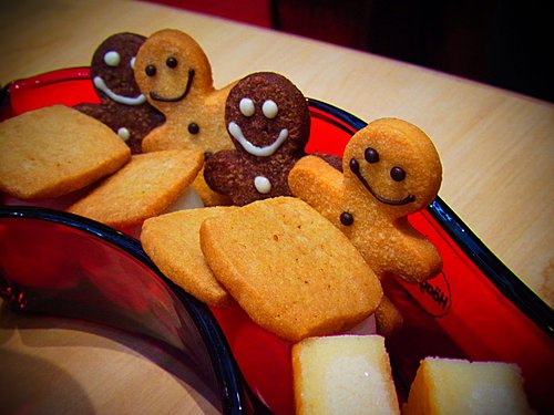 餅 點 拼 盤 包 括 蜜 果 曲 奇 、牛 油 曲 奇 、棉 花 糖 及 蜂 蜜 蛋 糕 ,見 到 4 件 薑 餅 人 ,好 想 . . . . .